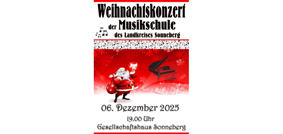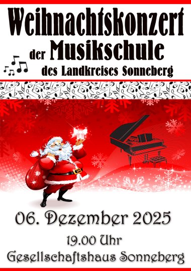 Wie immer klingt das Musikschul-Jahr mit dem traditionellen Weihnachtskonzert im Gesellschaftshaus Sonneberg aus, das diesmal am Samstag, dem 6. Dezember 2025, um 19:00 Uhr stattfindet. Alle Mitwirkenden bereiten sich seit Wochen mit Eifer auf ihren Auftritt vor, sei es als Gesangs- oder Instrumentalsolist, in der Jazzband, den Schülerbands oder dem Musikschulorchester. Der Musikschulchor und die Chöre des „Hermann Pistor“-Gymnasiums treten ebenfalls wieder geschlossen auf und werden die hoffentlich zahlreichen Besucher mit weihnachtlichen Melodien auf die Weihnachtszeit einstimmen. Karten gibt es in der Touristinformation Sonneberg und an der Abendkasse zum Preis von 6,- Euro (Kinder 3,- Euro). Die gesamte Musikschul-Familie freut sich auf zahlreiche Gäste!